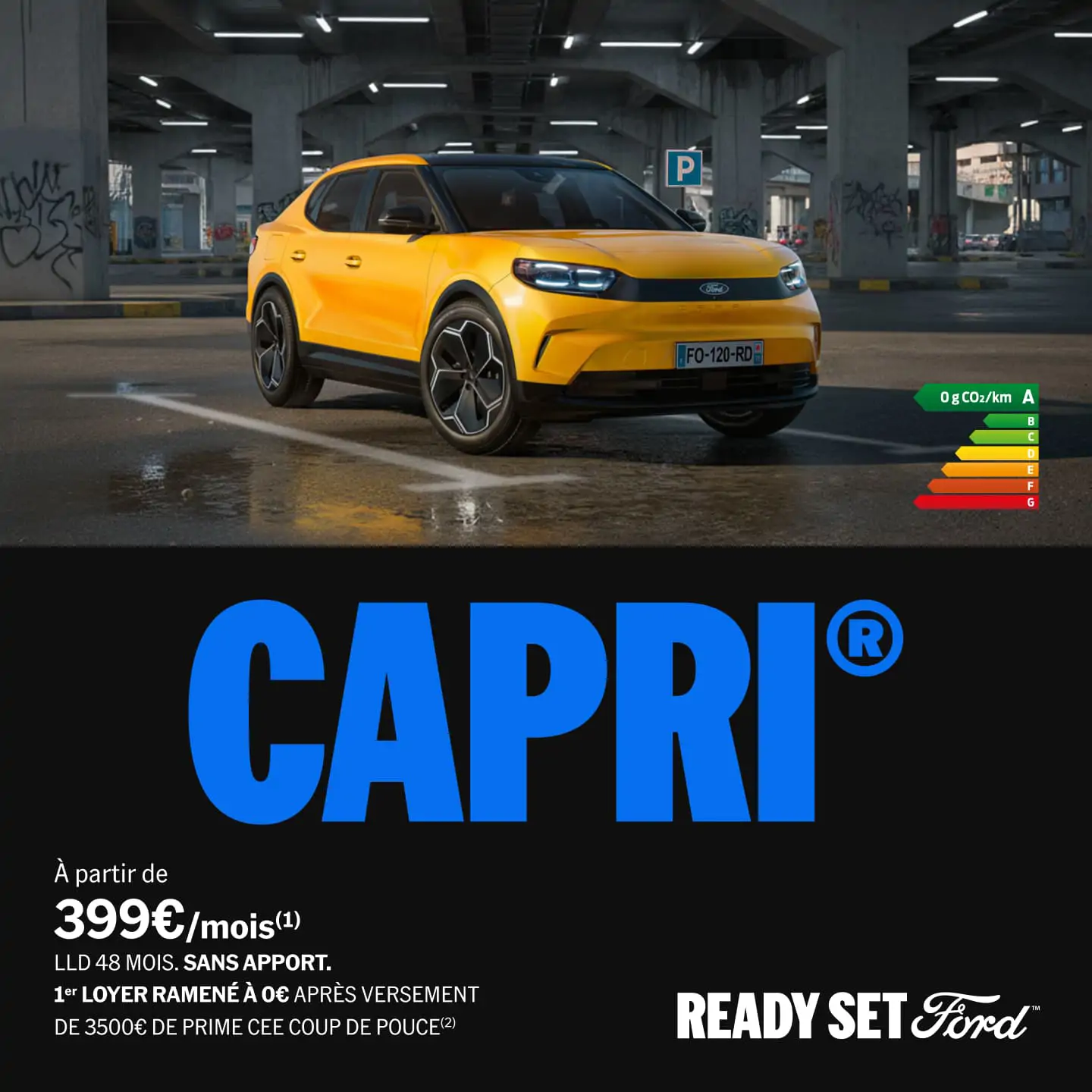 *Location longue durée (LLD) 48 mois / 40000 km d'une Ford Capri Style RWD Standard Range 58 kWh 190ch 2026.75MY neuve sans option. 1er loyer de 3500€ ramené à 0€ après remboursement d'une prime coup de pouce de 3500€, puis 47 loyers de 399€.**Montant de la prime CEE SIPLEC (SIREN : 315 281 113) prise en compte pour les clients particuliers, ménages classiques. La prime CEE est versée à postériori au client par le Concessionnaire sous réserve et après réalisation des contrôles obligatoires et satisfaisant conformément à la règlementation en vigueur. Voir ford.fr